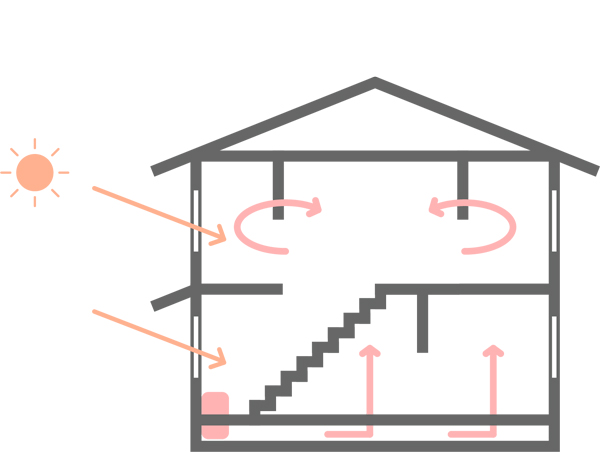 「暖かい空気は下から上へ、冷たい空気は上から下へ流れる」という空気の特性を活かし、夏はホールエアコンまたは小屋裏エアコン、冬は床下エアコンを稼働して効率的な空調を実現します。