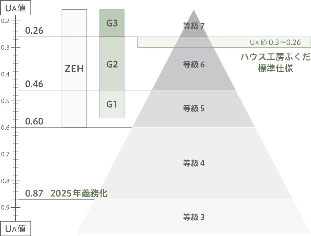 ハウス工房ふくだでは、コストパフォーマンスの高い断熱等級6.5(UA値0.3~0.26)を標準仕様としています。数値にばらつきがあるのは窓の面積による影響です。窓面積が少ないと断熱性能は高くなりますが、断熱性能が高くても室内空間が薄暗い家や景色の良い風景を取り入れないなど、本当の意味で快適な住環境とは思えません。